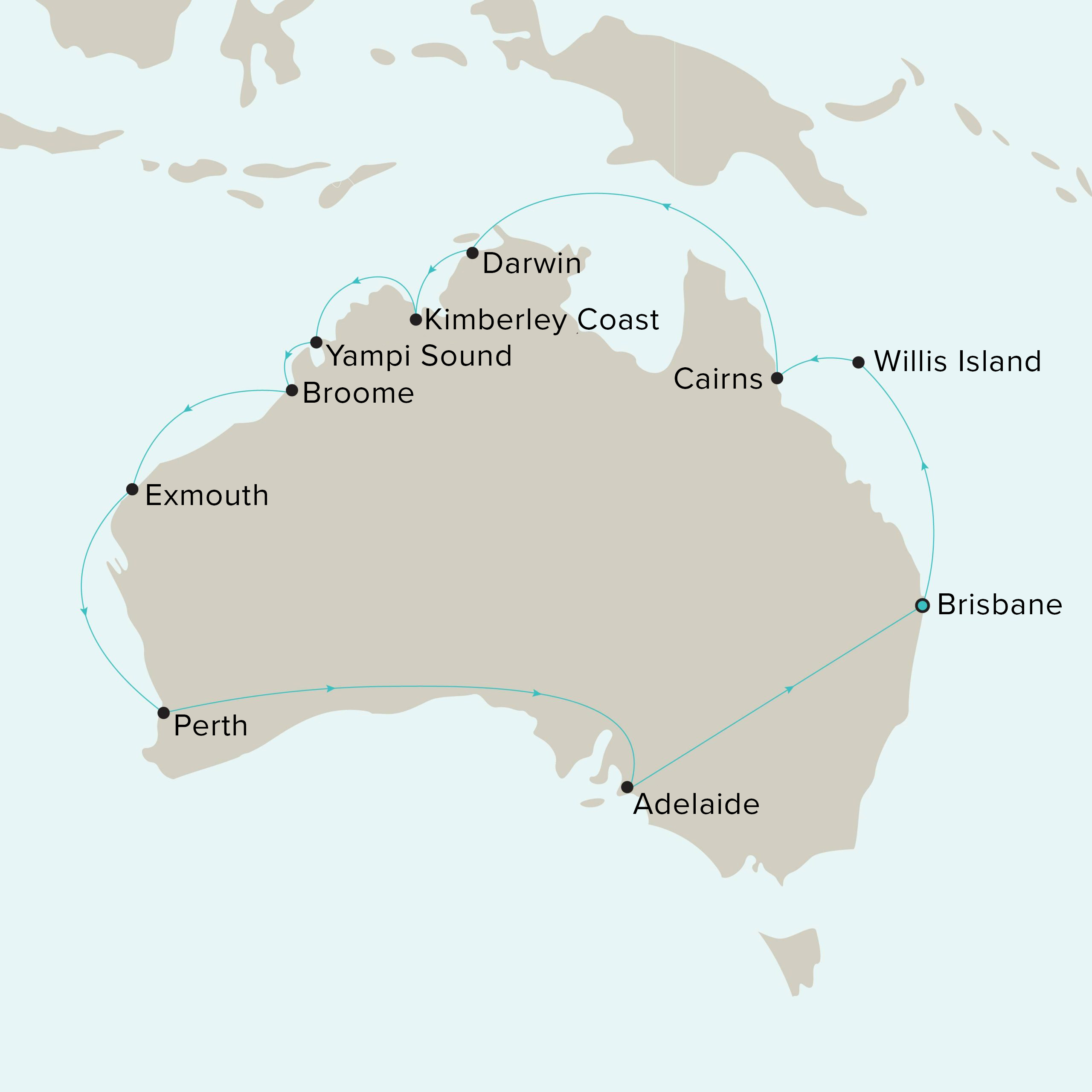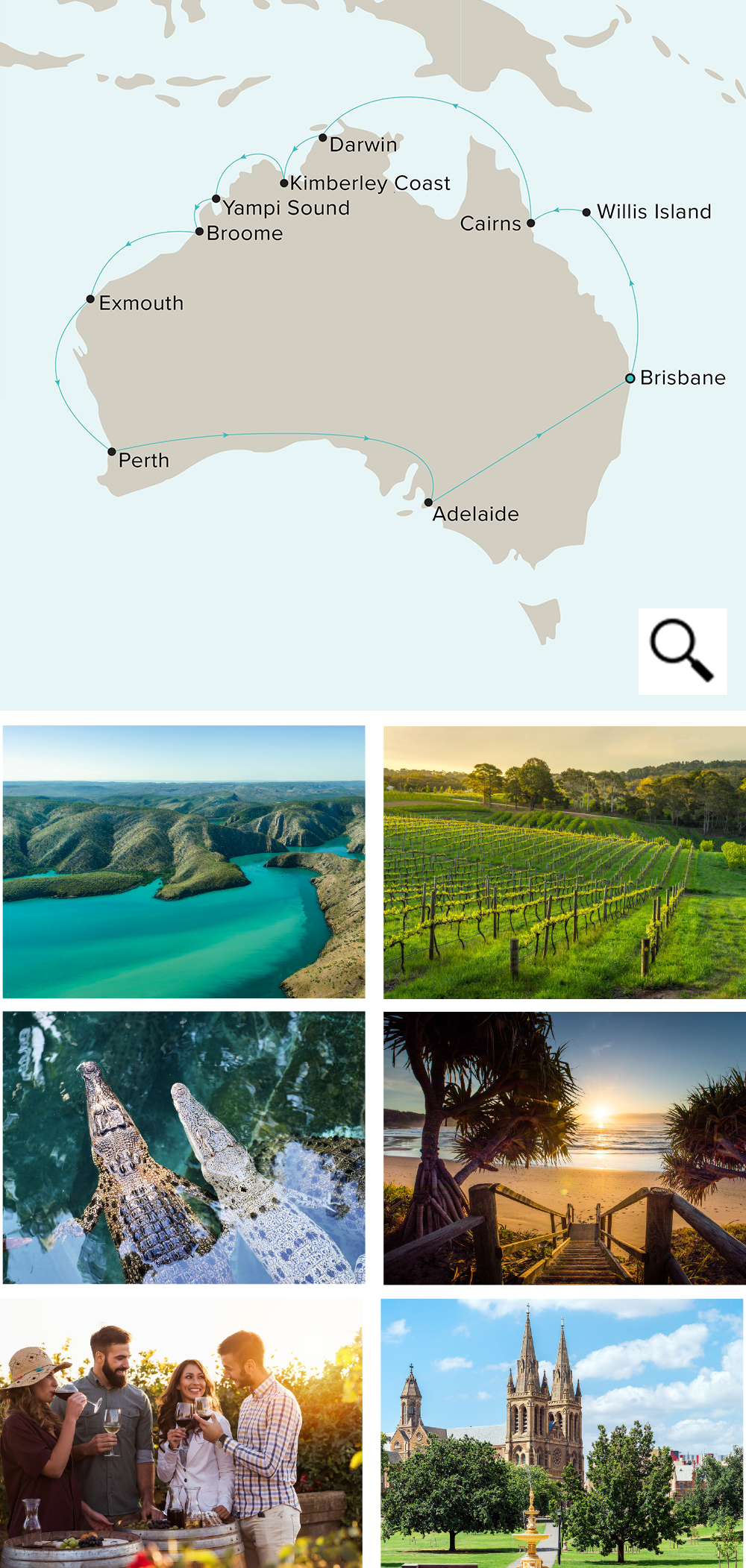 Complementing your ultimate rail odyssey, Sapphire Princess® will transport you through cerulean seas from Brisbane to Perth. Admire the vibrant wildlife of Willis Island and Cairns, glide past the Kimberley Coast’s amber rocks, and encounter Exmouth’s relaxed ambience.