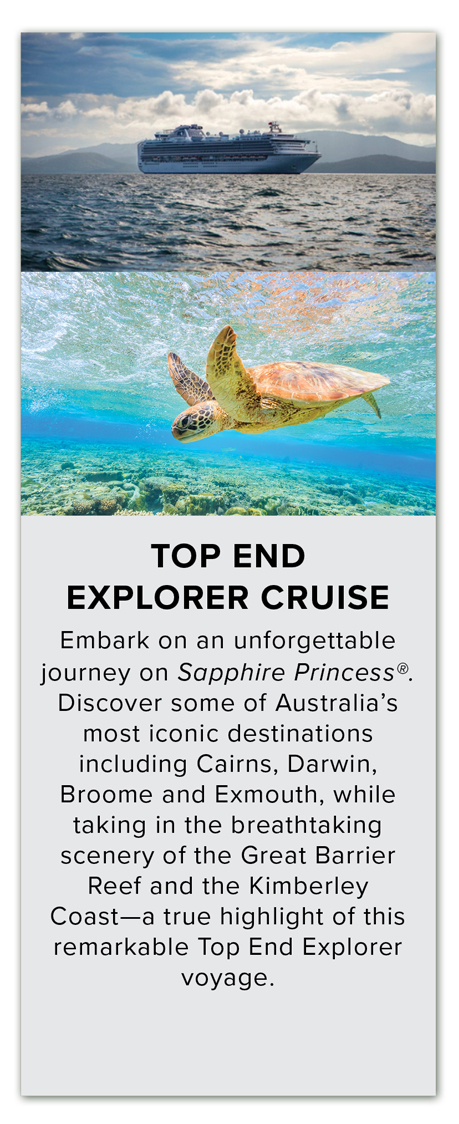 Traverse the length and breadth of Australia on board not just one, but two legendary rail journeys – enhanced by an immersive Princess Cruises Top End discovery.