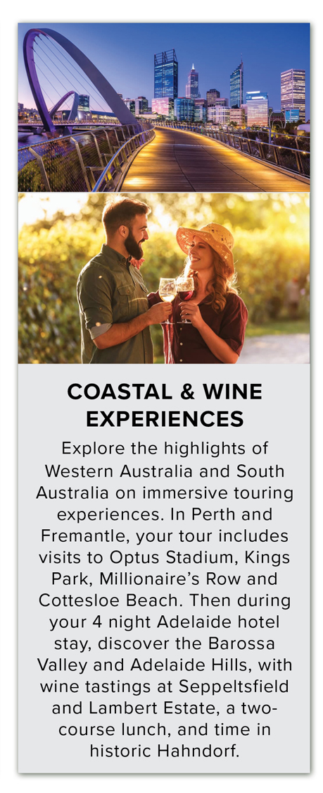 • Barossa Valley and Hahndorf tour including Seppeltsfield Winery with tasting, Lambert Estate with a two-course lunch and wine tasting, the Adelaide Hills and Handorf (Adelaide’s oldest German settlement)