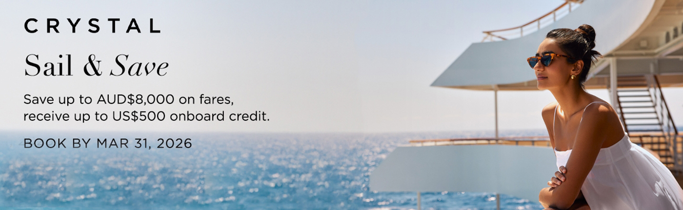 Terms and Conditions: Sail & Save (“Offer”) is valid on new bookings made between December 15, 2025 and March 31, 2026, on select voyages. Guests will receive savings of up to USD 2,500/ CAD 4,000 / GBP 2,500 / EUR 2,500 / AUD 4,000 and USD 250 ‘As You Wish’ shipboard credit per guest; based on voyage and guest room/suite category. Eligible combination sailings will receive the savings and shipboard credit specified for that combination itinerary, which may not equal the combined benefits of the individual voyage segments. Offer only available to the first and second full-fare guests in a guest room or suite. Third and fourth guests do not qualify. Full World Cruise and full Grand Journeys are excluded. Cancel and re-books do not qualify. Offer is capacity controlled and subject to availability. Offer may be combined with all active promotions. Offer is not combinable with net fares. Changes to booking may result in a reduction/forfeiture of the credit. Crystal reserves the right to correct errors. Offer can be modified or withdrawn anytime without prior notice. Single supplements apply and vary by voyage. Other restrictions may apply. The Caribbean Included Air offer (“Offer”) is available on select 2026 Americas & Caribbean voyages; valid on new bookings made between December 15, 2025, and January 31, 2026. Guests booking Crystal air will receive up to USD$1,500/CAD$3,000/GBP£1,500/EUR€1,500/AUD$3,000 per person. Those electing to book their own air will receive an air credit of USD$1,000/CAD$2,000/GBP£1,000/EUR€1,000/AUD$2,000 per person, applied towards either their cruise booking or airport transfers. The Offer is combinable with Sail & Save, is capacity-controlled, subject to availability, and may be withdrawn at any time without notice. Offer is only available to the first and second full-fare guests in a guest room or suite. Third and fourth guests do not qualify. Cancel/rebooks do not qualify for this Offer. Changes to the booking may result in a partial or full loss of the air credit. Crystal reserves the right to correct errors. Additional restrictions may apply.