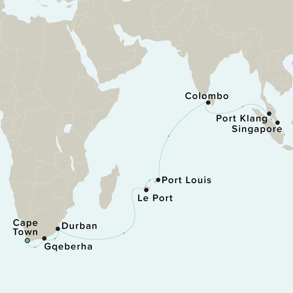 Set sail on an enchanting voyage from Cape Town to Singapore, discovering the captivating treasures of South Africa, the Indian Ocean, and Asia, perfectly paired with a hotel stay.