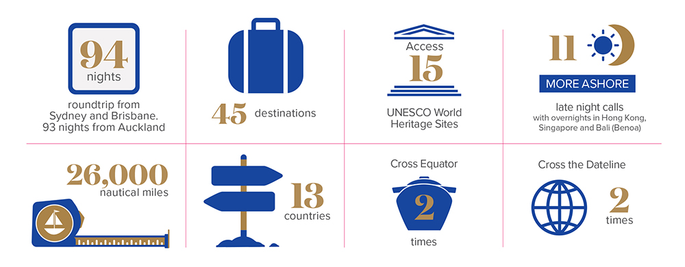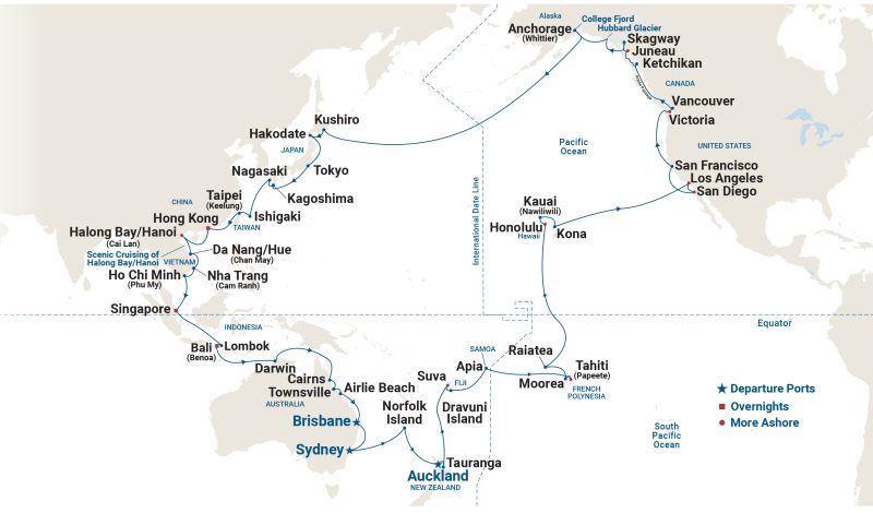 Over 94 fabulous nights you’ll experience mother nature’s vibrant tapestry on idyllic Pacific Islands, along Alaska’s majestic coastline and in Japan and Southeast Asia. Every sunrise brings a new, breathtaking horizon and every port unlocks a vibrant chapter of history, authentic flavours and wonder.